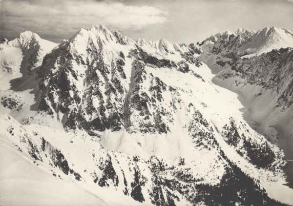 VYSOKÉ TATRY. Časť Mengusovskej doliny, dolina Zlomísk. Z ľava: Rysy (2499 m), Vysoká (2560 m), Končistá (2535 m), v pozadí Gerlachovský štít (2655 m).