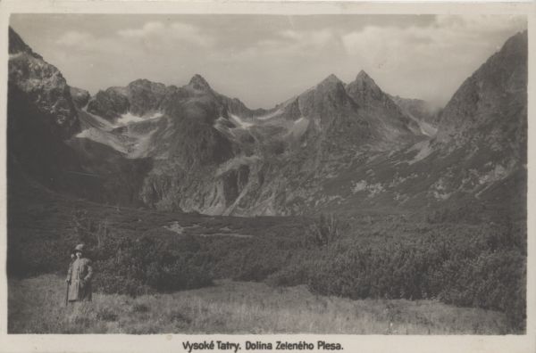 Dolina Kieżmarska. Widok na Baranie Rogi, Czarny Szczyt, Kołowy Szczyt i Jastrzębią Turnię. W przodzie turysta. Pod zdjęciem tytuł.