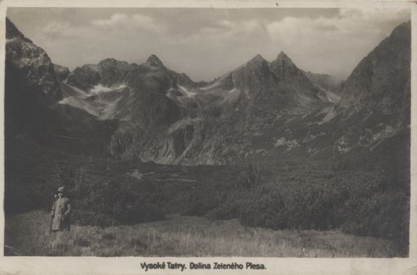 Dolina Kieżmarska. Widok na Baranie Rogi, Czarny Szczyt, Kołowy Szczyt i Jastrzębią Turnię. W przodzie turysta. Pod zdjęciem tytuł.