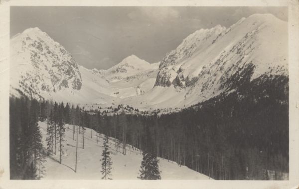 Widok na Dolinę Młynick± w zimie. Od lewej: Szczyrbskie Solisko, Szczyrbski Szczyt, Szatan, Skrajna Baszta.