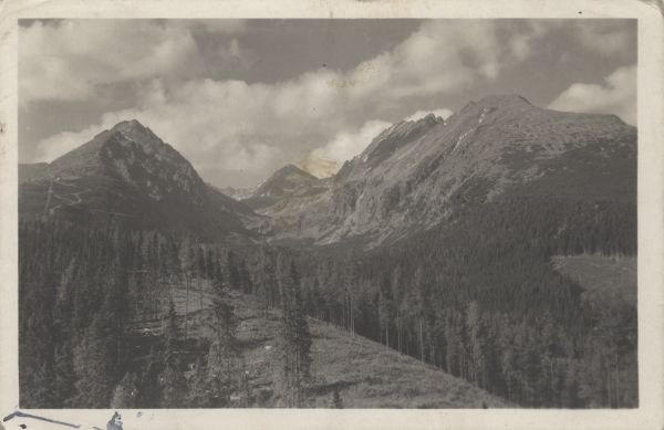 Dolina Młynicka. Na pierwszym planie las nad Szczyrbskim Jeziorem. W głębi szczyty, od lewej Szczyrbskie Solisko, Szczyrbski Szczyt, Szatan i Skrajna Baszta.
