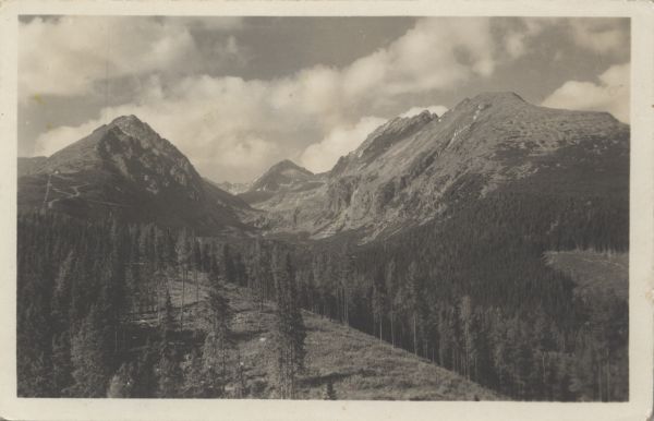Dolina Młynicka. Na pierwszym planie las nad Szczyrbskim Jeziorem. W głębi szczyty, od lewej Szczyrbskie Solisko, Szczyrbski Szczyt, Szatan i Skrajna Baszta.