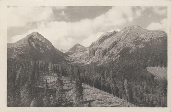 Dolina Młynicka. Na pierwszym planie las nad Szczyrbskim Jeziorem. W głębi szczyty, od lewej Szczyrbskie Solisko, Szczyrbski Szczyt, Szatan i Skrajna Baszta.