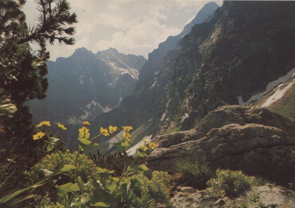 Widok na Mięguszowieckie Szczyty i Kazalnicę. W tle widać Rysy. na pierwszym planie kaczeniec (knieć błotna górska).