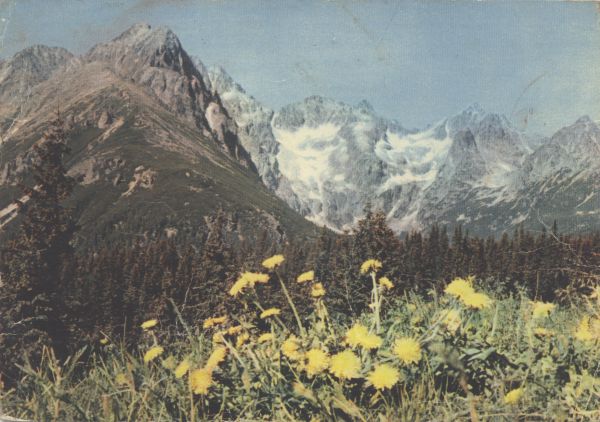Widok na otoczenie Kotliny Zielonego Stawu Kieżmarskiego. Od lewej: Łomnica, Kieżmarski Szczyt, Durny Szczyt, Mały Durny Szczyt, Baranie Rogi, Czarny Szczyt , Kołowy Szczyt, przed nim Jastrzębia Turnia. Na pierwszym planie polana i kwitn±cy omieg kozłowiec (Doronicum clusii), na dalszym planie las.