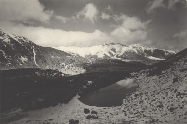 VYSOKÉ TATRY. Pohľad od Čierneho plesa (1579 m) v doline Zeleného plesa na hrebeň Belanských Tatier (Predné jatky, 2012 m) a Bujačí vrch (1946 m).