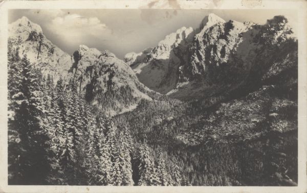 Zimowe widok z Siodełka do Doliny Małej Zimnej Wody. Z lewej Pośrednia Grań, z prawej Łomnica.