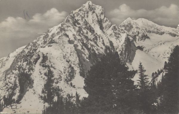 Zimowy widok na Pośrednią Grań. W tle Lodowy Szczyt. Na pierwszym planie limba.
