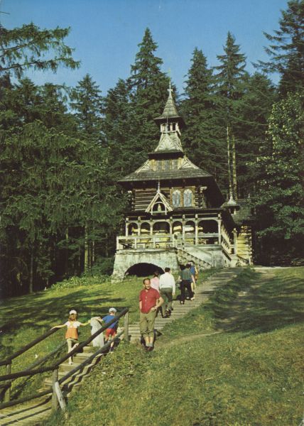 ZAKOPANE. Kaplica w stylu zakopiańskim w Jaszczurówce proj. arch. Stanisława Witkiewicza.