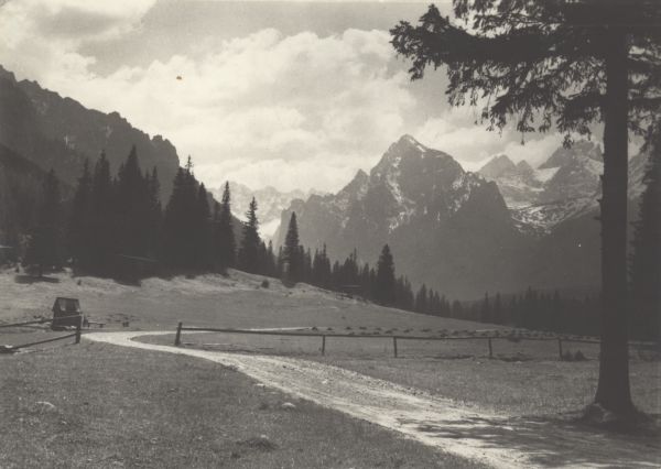 Polana Białej Wody. Widok na Młynarz, Niżni Żabi Szczyt i Wyżni Żabi Szczyt. Na pierwszym planie szlak turystyczny, obok niego zabudowane Ľródło.