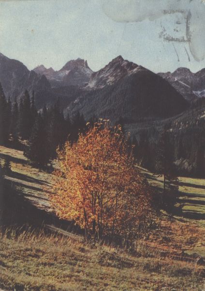Widok z Doliny Białej Wody na Rysy, Żabi± Czubę i Wielki Mięguszowiecki Szczyt. Na pierwszym planie polana i drzewa li¶ciaste w jesiennych barwach.