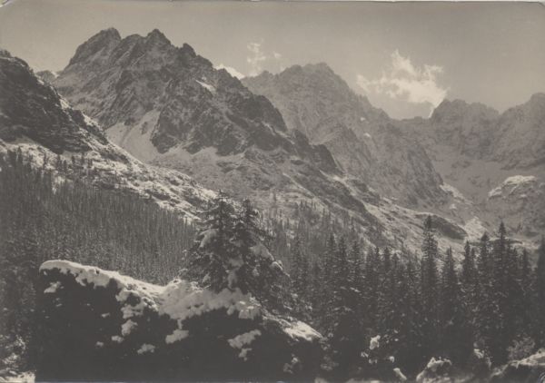 Zimowy widok z Doliny Białej Wody na południe: w przodzie ¦wistowe Turnie, w tle Zadni Gerlach, Batyżowiecki Szczyt i Kaczy Szczyt.
