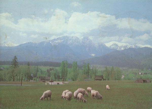 Owce pasące się na Polanie Szymoszkowej w Zakopanem. W tle widać ośnieżony Giewont, Kasprowy wierch i Czerwone Wierchy.