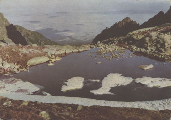 Tatry Wysokie. Dolina Małej Zimnej Wody. Widok od Małego Stawu Spiskiego do Spiskiej Kotliny. Tytuł również w języku: ros., ang., niem.