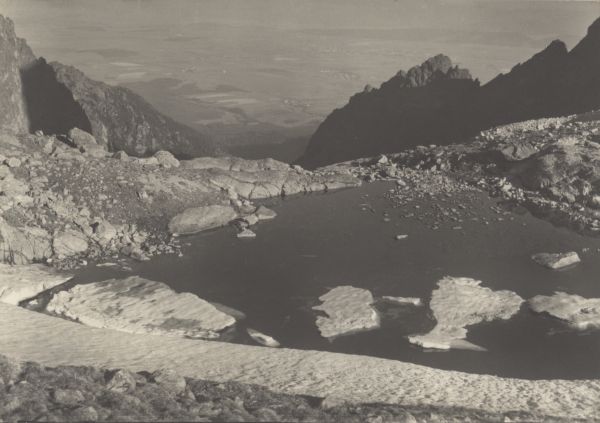 TATRANSKĘ NÁRODNĘ PARK. Malé Spičské pleso (1990 m) v Malej Studenej doline. Poh”ad do Popradskej doliny, v”avo Lomnickę hrebeò, vpravo Prostrednę hrot (2440 m).