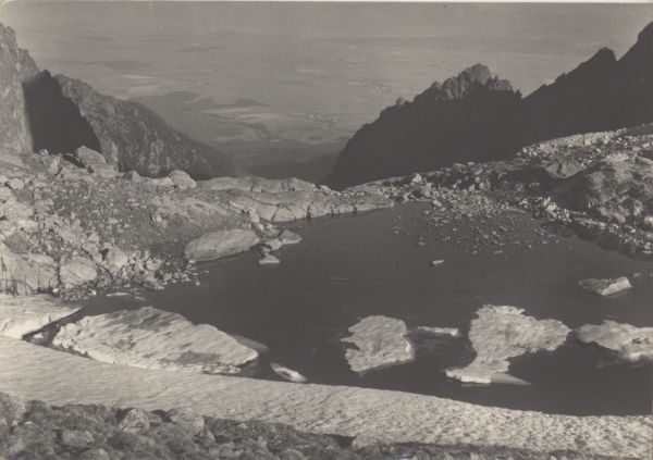 TATRANSKĘ NÁRODNĘ PARK. Malé Spičské pleso (1990 m) v Malej Studenej doline. Poh”ad do Popradskej doliny, v”avo Lomnickę hrebeò, vpravo Prostrednę hrot (2440 m).