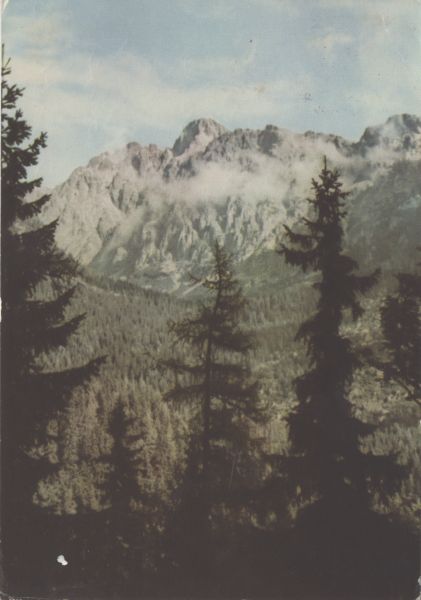 Tatrzański Park Narodowy [Słowacja] - Widok z Siodełka do Doliny Małej Zimnej Wody i na masyw Łomnicy. Tytuł również w języku: ros., ang., niem.