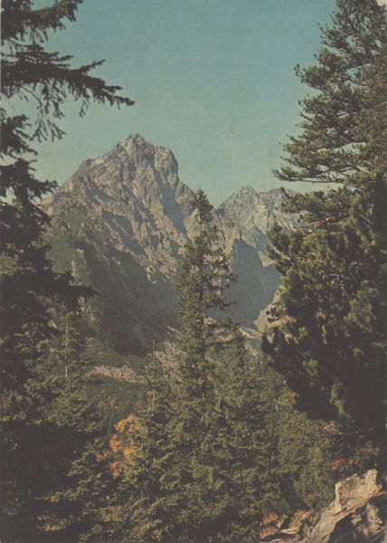 Tatry Wysokie. Widok z Magistrali Tatrzańskiej do Doliny Małej Zimnej Wody. Tytuł również w języku: niem., ang., ros.