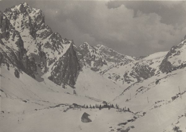 Dolina Małej Zimnej Wody w zimowej scenerii. W tle: Po¶rednia Grań, Lodowa Kopa i Lodowy Szczyt.