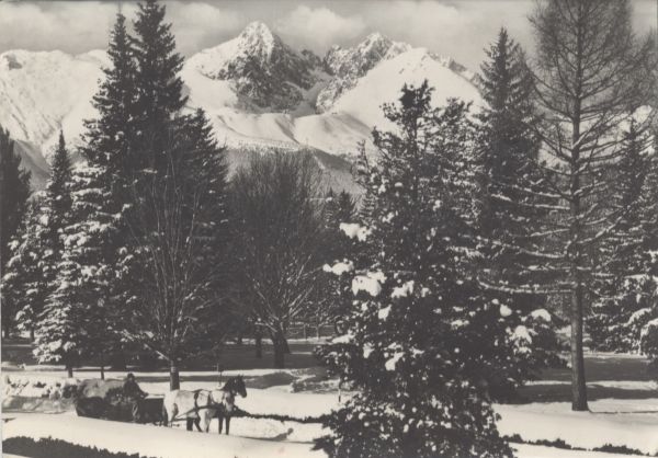 Park w Tatrzańskiej Łomnicy w zimowej scenerii. W przodzie sanie z 2 końmi i woŒnic±. W tle Łomnica i Kieżmarski Szczyt.