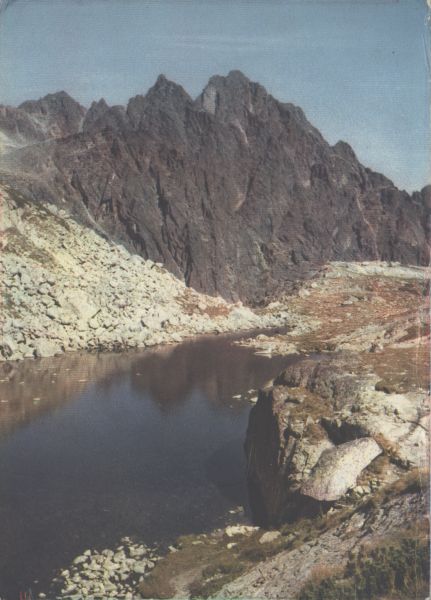 Tatry Wysokie - Widok znad Harnaskiego Stawu na Żółty Szczyt i Pośrednią Grań. Tytuł również w języku: ros., niem., ang.