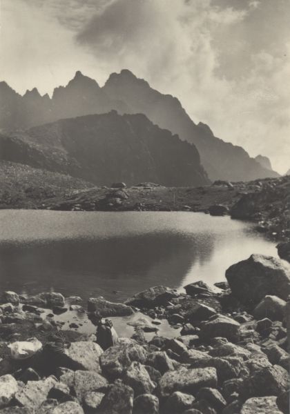 VYSOKÉ TATRY - Veľká Studená dolina Pohľad od Starolesnianskeho plesa (2008 m) na Žltú vežu (2385 m) a Prostredný hrot (2440 m). V popredí Strelecká veža (2130 m)