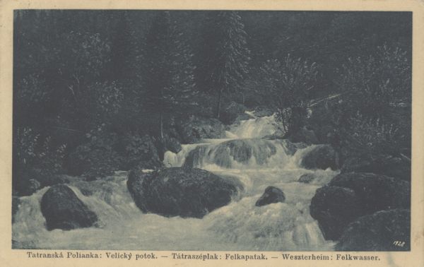 Tatrzańska Polanka. Wielicki Potok. Pod zdjęciem drukowany tytuł, również w języku węgierskim i niemieckim.