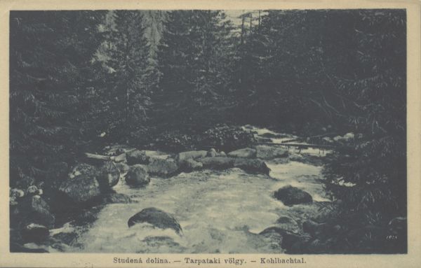Potok w Dolinie Zimnej Wody. Pod zdjęciem drukowany tytuł, również w języku węgierskim i niemieckim.