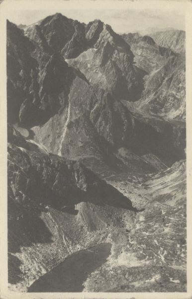 Widok z Małej Wysokiej na Zmarzły Staw pod Polskim Grzebieniem w Dolinie Litworowej. W tle Rysy i Ciężki Szczyt.