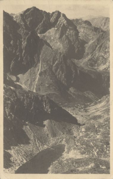 Widok z Małej Wysokiej na Zmarzły Staw pod Polskim Grzebieniem w Dolinie Litworowej. W tle Rysy i Ciężki Szczyt.