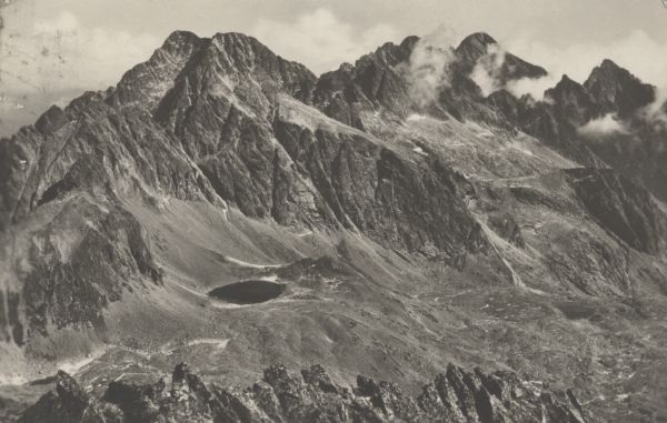 Widok z Małej Wysokiej na Zmarzły Staw Staroleśny w Dolinie Staroleśnej. W tle od lewej: Lodowy Szczyt, Lodowa Kopa, poniżej Jaworowy Szczyt, Durny Szczyt, Łomnica i Pośrednia Grań.