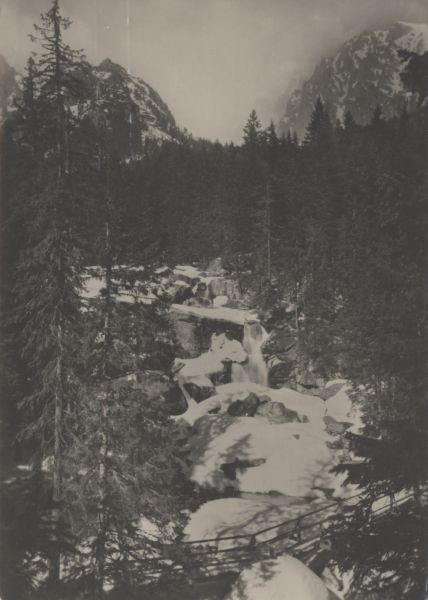 Widok na Długi Wodospad w Dolinie Zimnej Wody w zimowej szacie. Na pierwszym planie mostek. Wokół wodospadu las. W tle po lewej stronie Rywociny, po prawej fragment masywu Łomnicy.