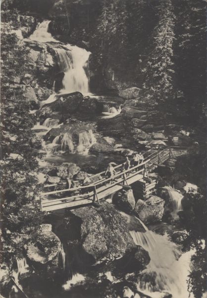 Wodospady Zimnej Wody w Dolinie Zimnej Wody. Na pierwszym planie mostek, po którym idą turyści.