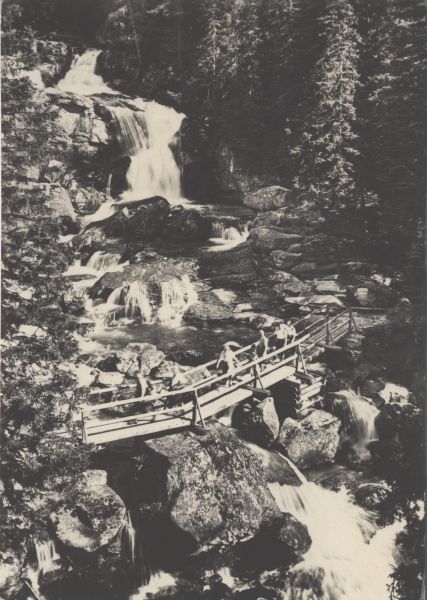 Wodospady Zimnej Wody w Dolinie Zimnej Wody. Na pierwszym planie mostek, po którym idą turyści.