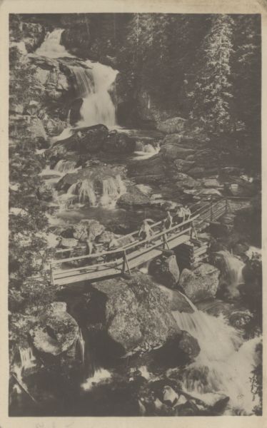 Wodospady Zimnej Wody w Dolinie Zimnej Wody, w tle las. Na pierwszym planie mostek, po którym idą turyści.