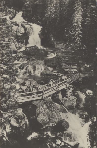 Wodospady Zimnej Wody w Dolinie Zimnej Wody, w tle las. Na pierwszym planie mostek, po którym idą turyści.