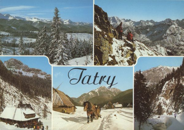 Pocztówka 5. elementowa, zimowa. Na zdjęciu panorama Tatr z Głodówki, widoczne Kasprowy Wierch i Giewont. Obok widok ze szlaku na Świnicę w kierunku Dol. Pięciu Stawów Polskich, na szlaku odpoczywający turyści. Poniżej po lewej stronie schronisko na Hali Kondratowej, przed schroniskiem turyści, w tle zbocza Giewontu. Obok Polana Chochołowska z szałasami, na pierwszym planie sanie zaprzężone w konia, w tle Kominiarski Wierch. Obok Dolina Kościeliska. Napis: Tatry.