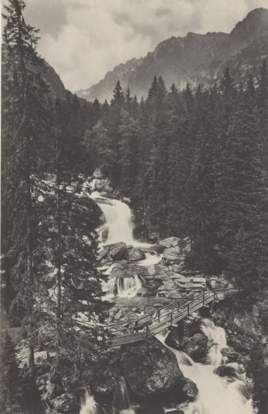 Widok na Wodospady Zimnej Wody, w tle las i masyw Łomnicy.