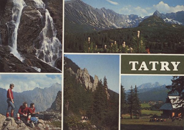 Pocztówka 5. elementowa. Na zdjęciu po lewej stronie u góry Siklawa. Obok widok z Hali Gąsienicowej w tle po prawej Kościelec. Poniżej widok na Giewont. Obok Kominy w Dolinie Strążyskiej. Obok turyści na progu Dolinki za Mnichem.
