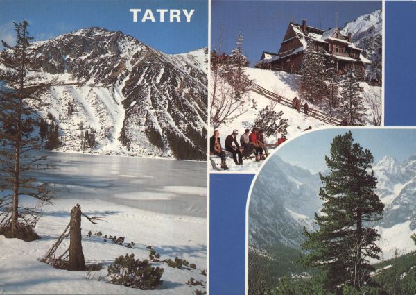 Pocztówka 3. elementowa, zimowa. Na zdjęciu po lewej stronie zamarznięta tafla Morskiego Oka, w tle Miedziane. Obok u góry schronisko nad Morskim Okiem im St. Staszica, nad stawem turyści. Poniżej limba. Napis: TATRY.