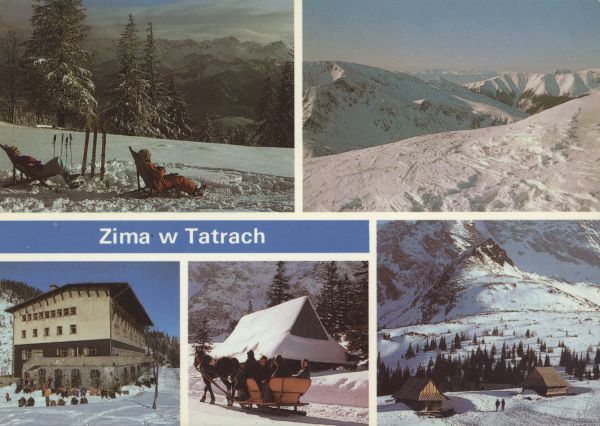 Pocztówka 5. elementowa, zimowa. Na zdjęciu u góry po lewej stronie turyści opalający się w tle panorama Tatr Wysokich. Obok zaśnieżona Cicha Dolina widziana z Kasprowego Wierchu. Poniżej Hala Gąsienicowa, w tle Kościelec. Obok turyści w saniach na drodze do Morskiego Oka. Obok schronisko-hotel górski na Kalatówkach. Przed schroniskiem turyści. Napis: Zima w Tatrach.