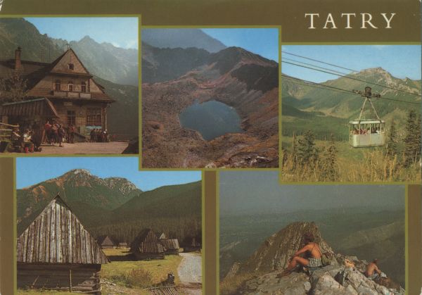 Pocztówka 5. elementowa. Na zdjęciu u góry po lewej stronie schronisko nad Morskim Okiem im. St. Staszica. Obok Zadni Staw w Dolinie Pięciu Stawów Polskich. Obok wagonik kolei linowej na Kasprowy Wierch, w tle Giewont. Poniżej od lewej szałasy na Polanie Chochołowskiej w tle Kominiarski Wierch. Obok turyści na Giewoncie.