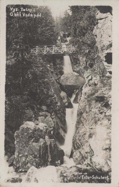 Widok na Wodospad Olbrzymi w Dolinie Małej Zimnej Wody. Na zdjęciu widoczny mostek stanowiący część Magistrali Tatrzańskiej.