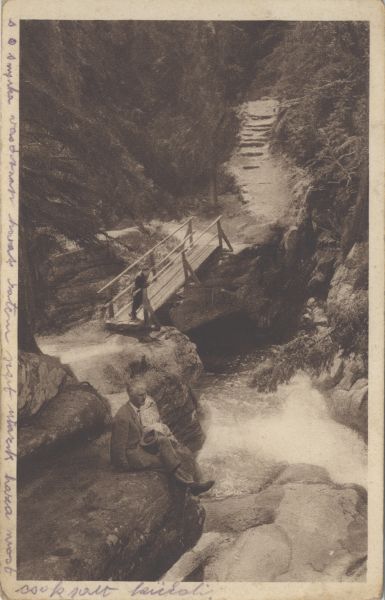 Wodospad w Dolinie Zimnej Wody. Widoczne Magistrala Tatrzańska, mostek i wypoczywający turyści.