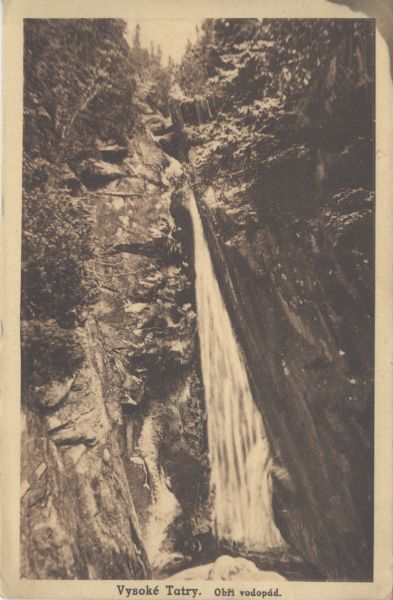 Widok na Wodospad Olbrzymi w Dolinie Małej Zimnej Wody. Pod zdjęciem podano tytuł pocztówki.