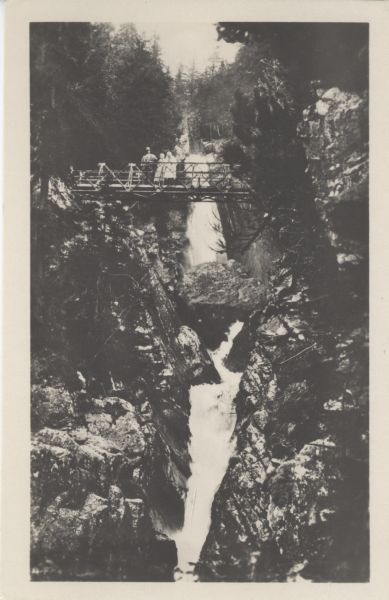 Widok na Wodospad Olbrzymi w Dolinie Małej Zimnej Wody. Na mostku, stanowiącym część Magistrali Tatrzańskiej 3. turyści.