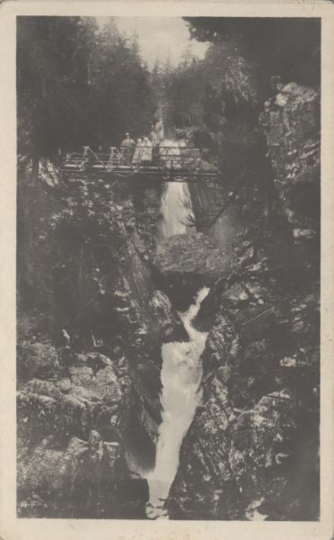 Widok na Wodospad Olbrzymi w Dolinie Małej Zimnej Wody. Na mostku, stanowiącym część Magistrali Tatrzańskiej 3. turyści.