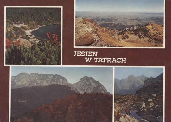 Pocztówka 4. elementowa. Na zdjęciu u góry po lewej stronie Morskie Oko i schronisko im. St. Staszica. Obok widok z Beskidu w kierunku Kasprowego Wierchu i Uhrocia Kasprowego. Poniżej po lewej widok na Giewont. Po prawej widok na Rysy z Dolinki za Mnichem. Napis: JESIEŃ W TATRACH.