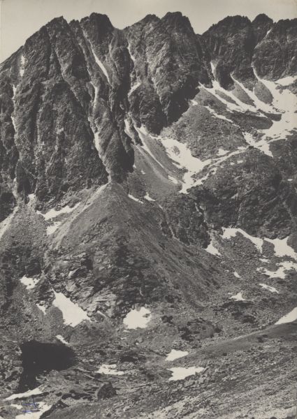 TATRY WYSOKIE - widok ze Skrajnej Baszty na Staw pod Skokiem i grań Solisk: Szczyrbskie i Małe Solisko, Skrajna i Zadnia Soliskowa Turnia, Wielkie Solisko.