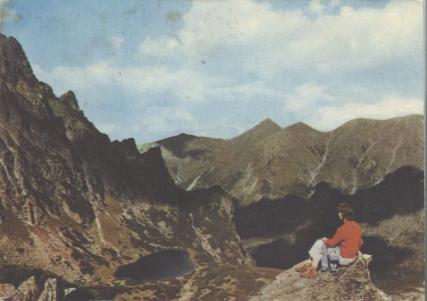Na pierwszym planie turysta siedzący na głazie. W głębi Ciężki Staw. W tle pejzaż Tatr Wysokich.